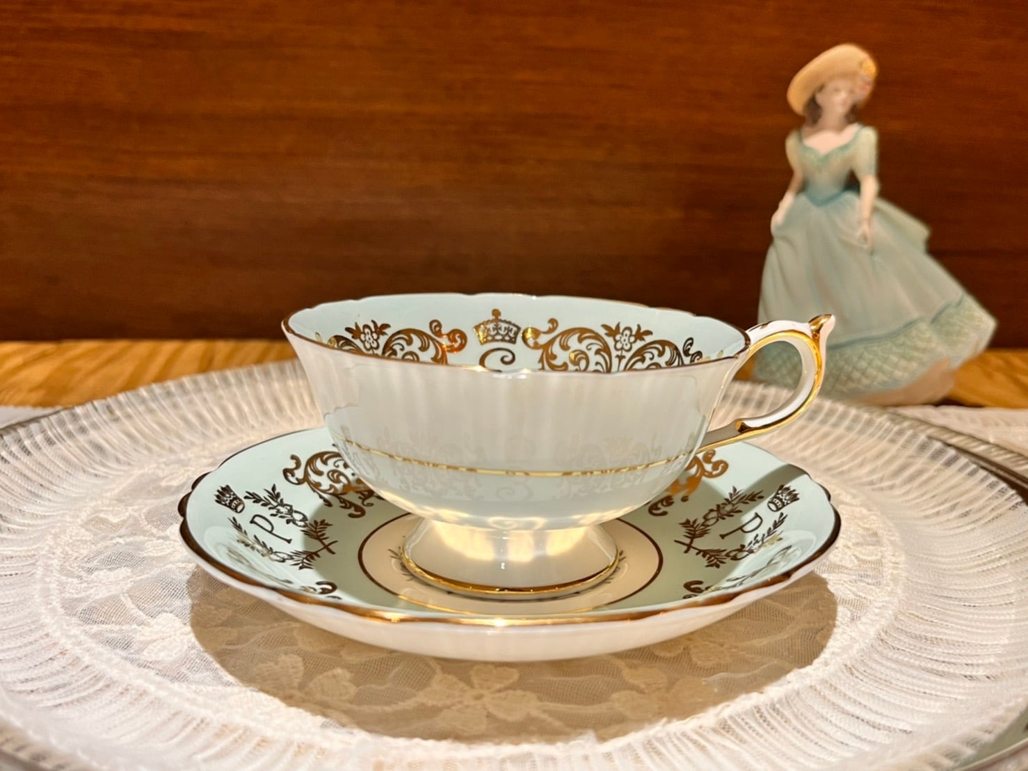 カップとソーサーの中央にはメイプルリーフが描かれており、ライトグリーンの背景に金彩でロイヤルカップルのイニシャルであるEとPを含む素晴らしい装飾が施されていますね♪