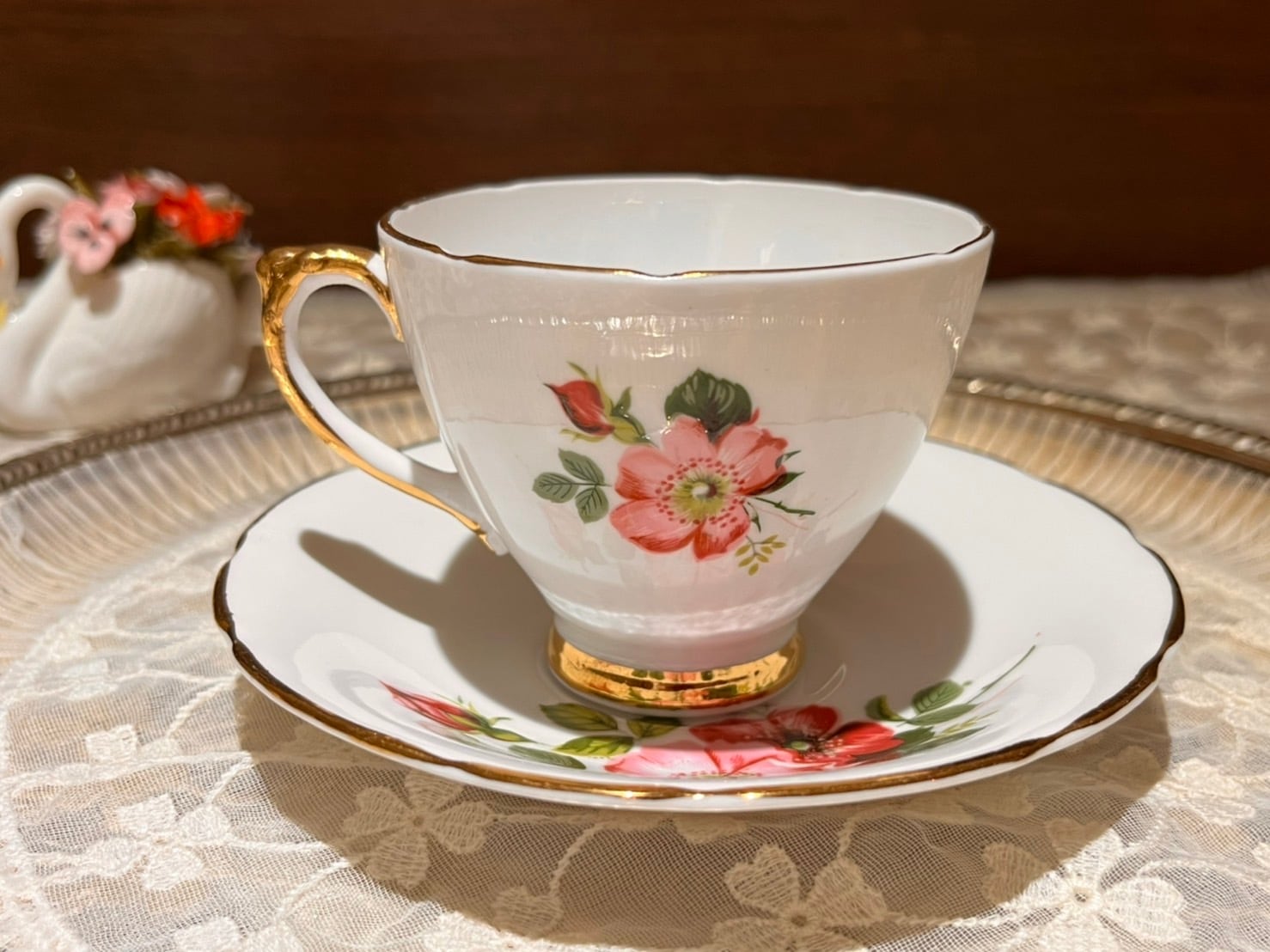 どちらも認知度は低いですが、フラワーハンドルやこちらの商品のように手の込んだ作品が数多く見られます。こちらのカップ&ソーサーにはハンドペイントの赤いお花が丁寧に描かれていますね♪