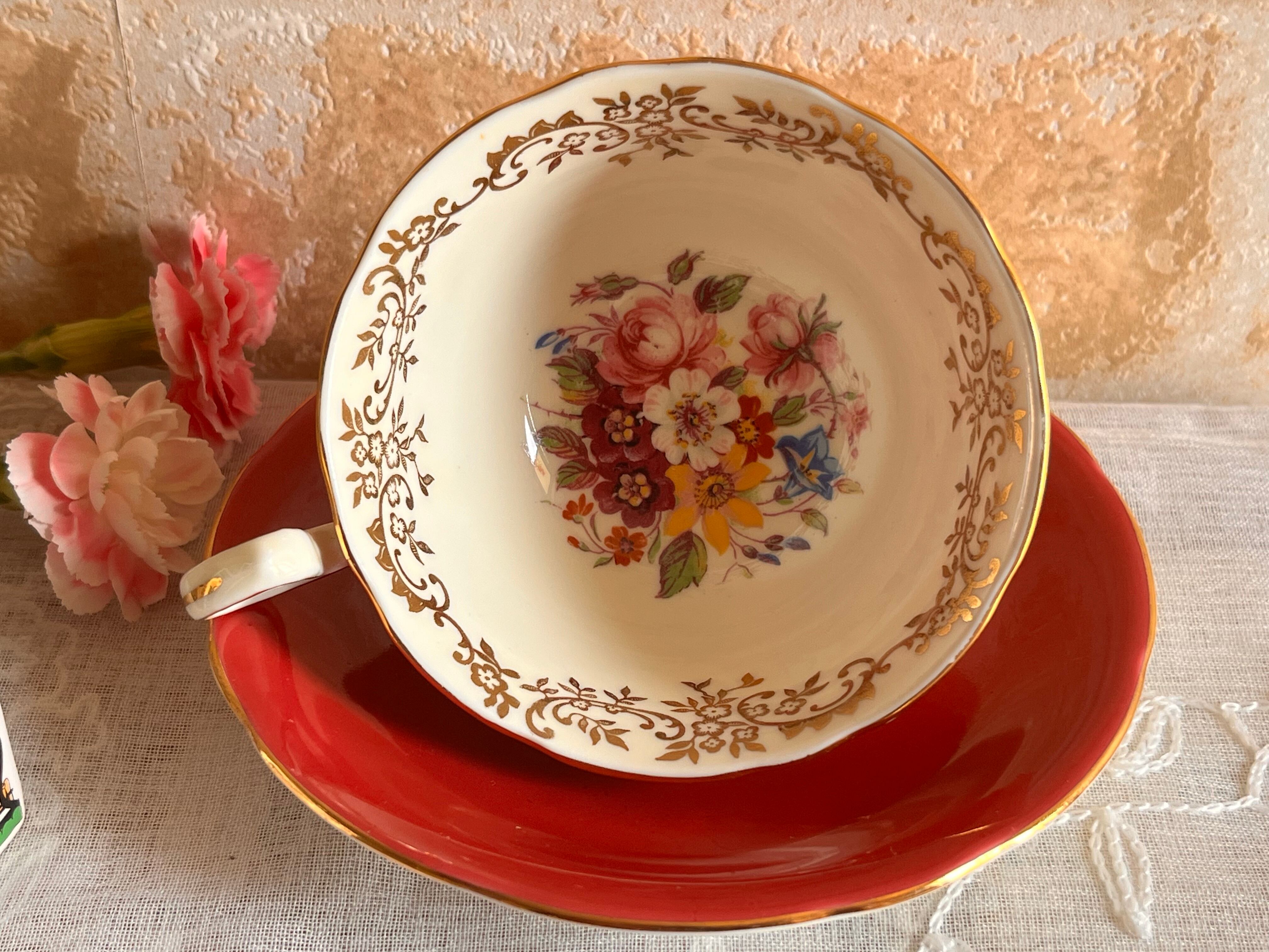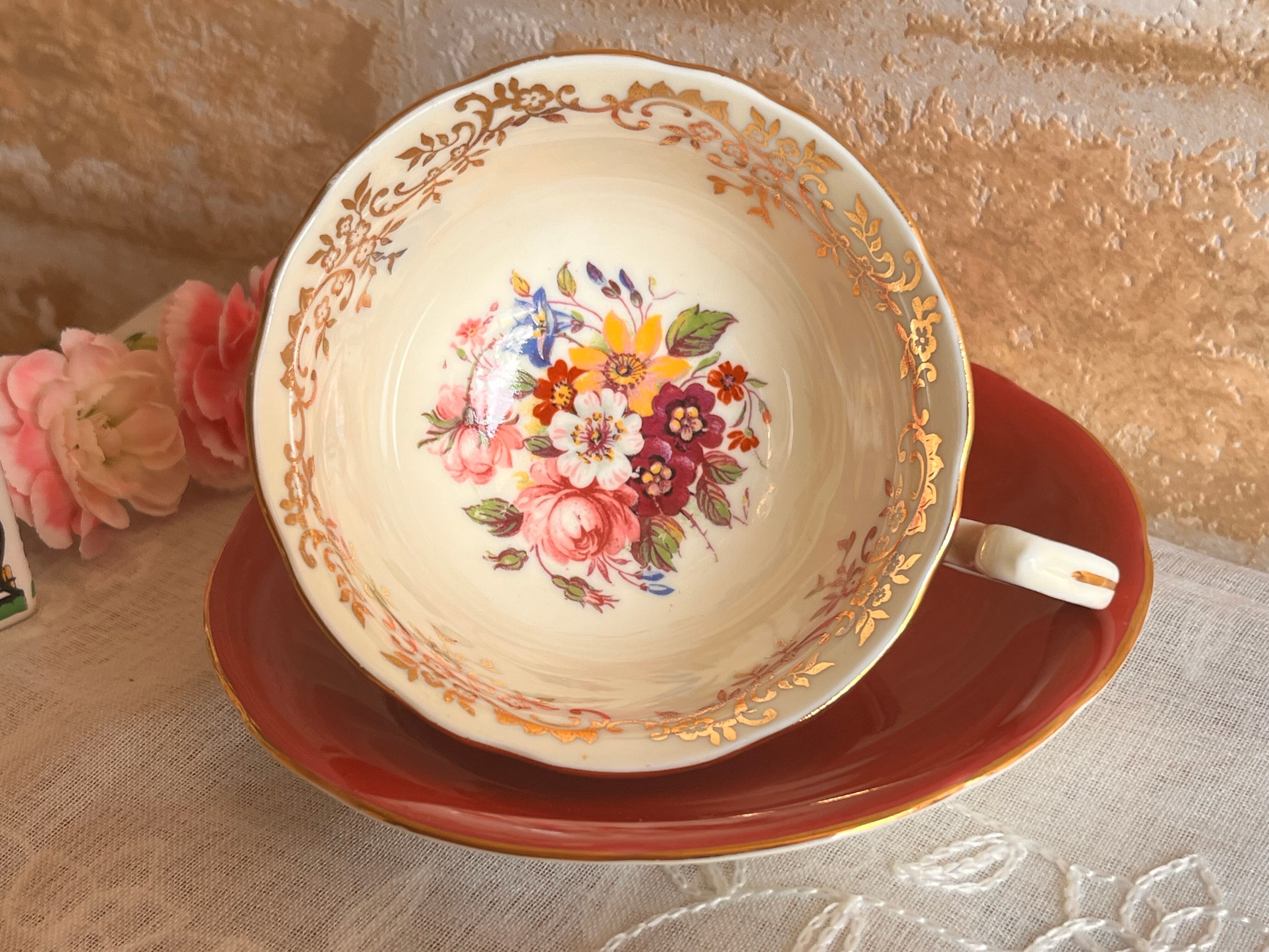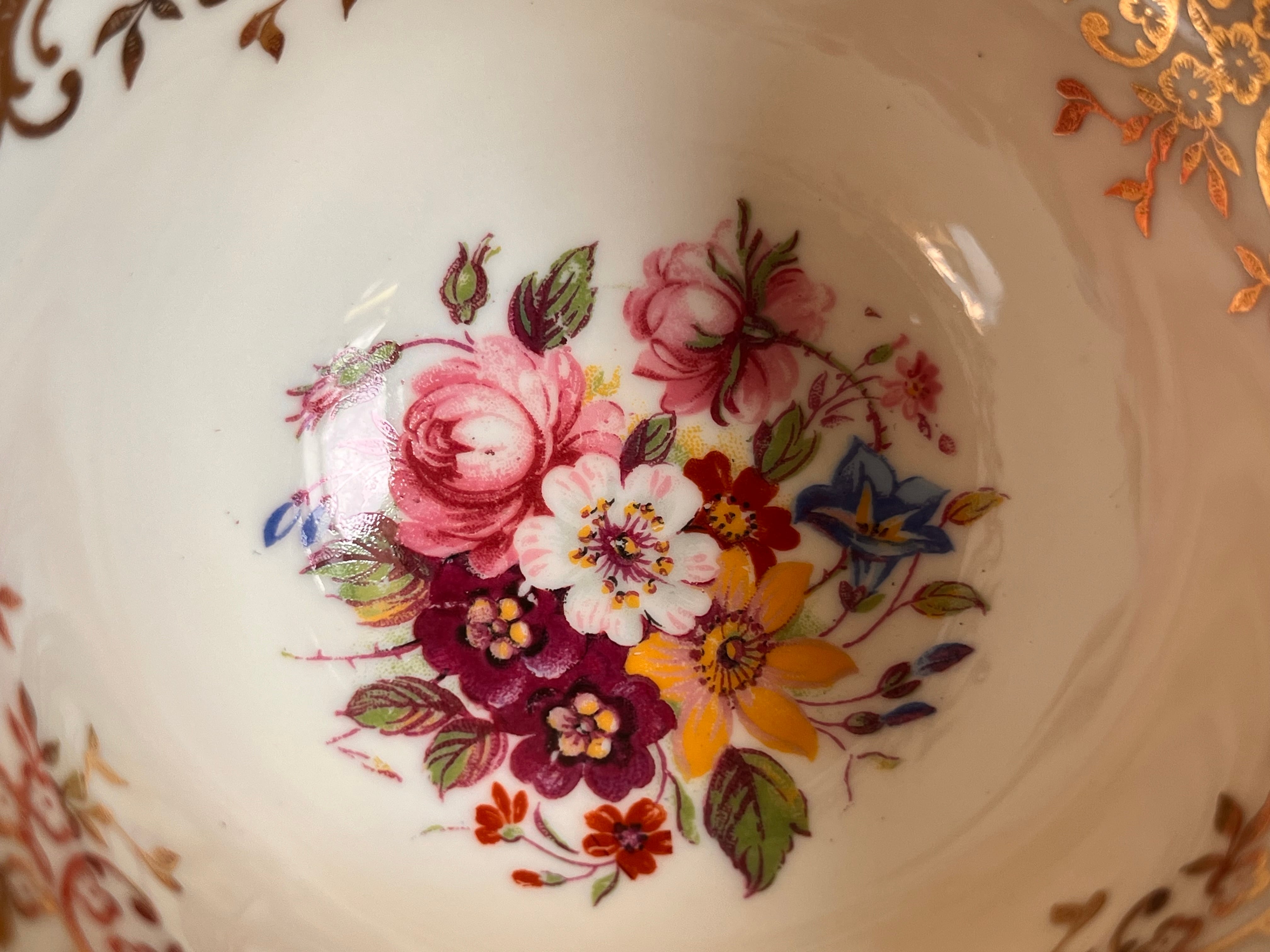 カップの真ん中に描かれた花束と大きく描かれたゴールドのフリルが特徴的で美しく